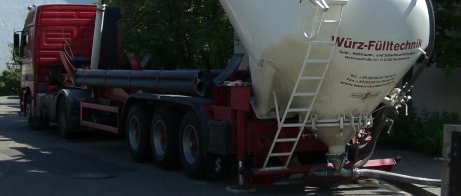 Hierzu werden verschiedene Sande und vergleichbare Materialien verwandt. Das Einfüllen erfordert einen erheblichen Aufwand, da spezielle Saug-Pumpwagen benötigt werden oder in zeit- und personalintensivem Verfahren der Tankbehälter verfüllt werden muss.